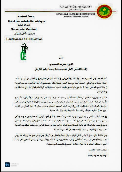 في بيانٍ حمل نَفَسًا وطنيًا عميقًا، وصف المجلس الأعلى للتهذيب المدرسةَ الجمهورية بأنها مشروعٌ وطني جامع يعزز اللُّحمة بين مكوّنات الشعب الموريتاني، ويرسّخ في الأجيال القادمة قيم المواطنة والعدالة والانتماء للوطن.