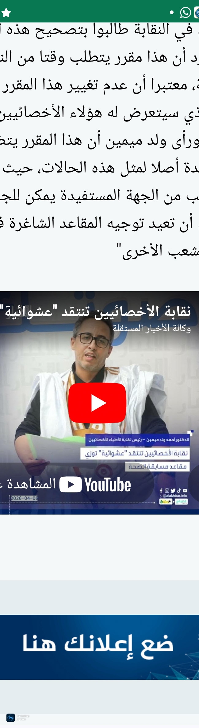 ودعت النقابة الرئيس محمد ولد الغزواني إلى التدخل العاجل لتصحيح المسار، وضمان عدالة التمثيل بين مختلف التخصصات، بما يستجيب لحاجيات المنظومة الصحية الوطنية.