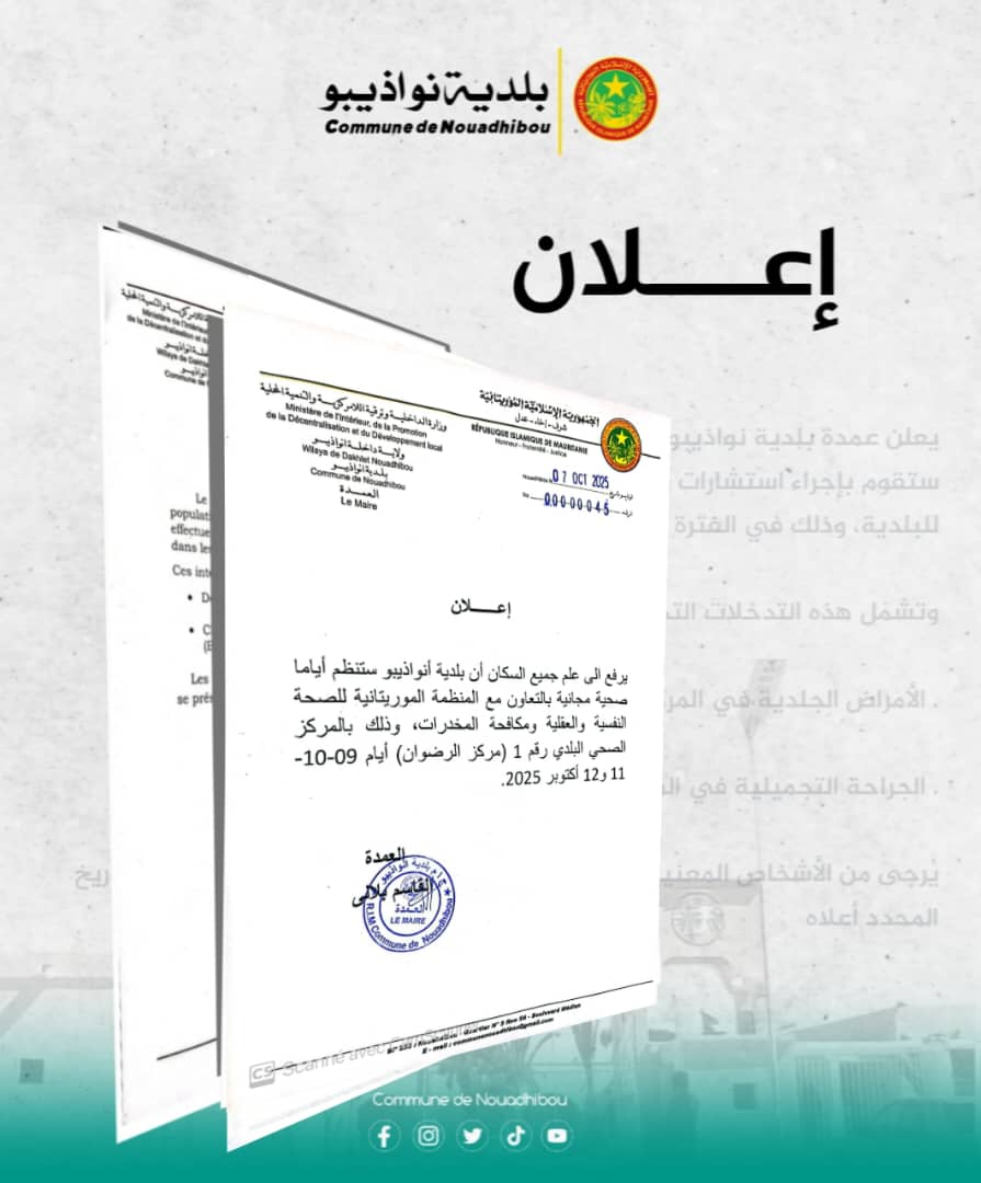 يرفع إلى علم جميع السكان أن بلدية أنواذيبو ستنظم أياماً صحية مجانية بالتعاون مع المنظمة الموريتانية للصحة النفسية والعقلية ومكافحة المخدرات، وذلك بالمركز الصحي البلدي رقم 1 (مركز الرضوان) أيام 09-10-11 و12 أكتوبر 2025.