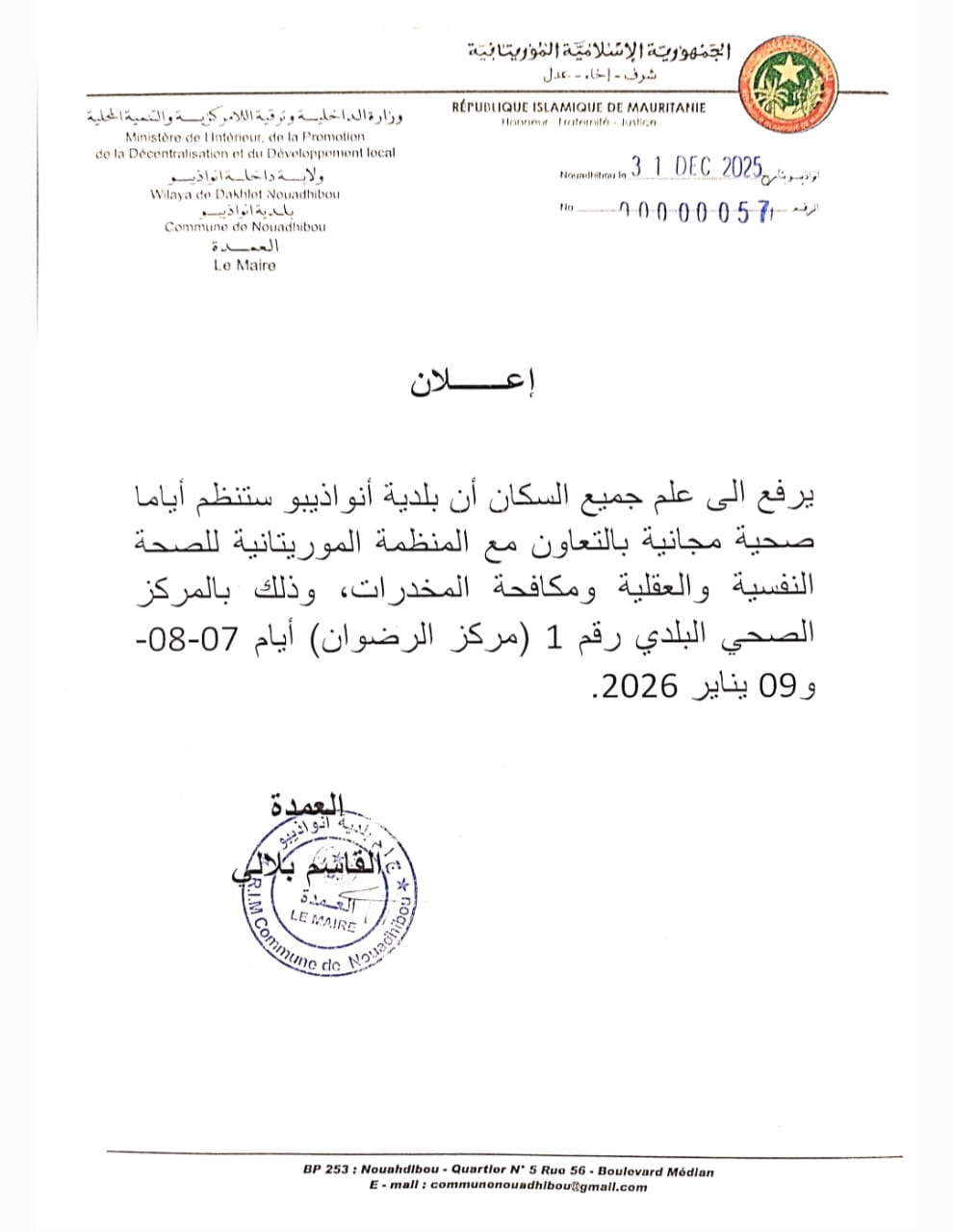 تدعوكم بلدية نواذيبو إلى مواكبة عمل البعثة الطبية المتخصصة في الصحة النفسية والعقلية، التي باشرت نشاطها صباح اليوم عند الساعة ، وتستمر أعمالها لمدة ثلاثة أيام، وذلك بالمركز البلدي الصحي (الرضوان).