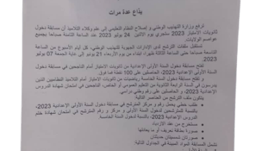 حددت وزارة التهذيب الوطني وإصلاح النظام التعليمي تاريخ إجراء مسابقة مدارس الامتياز حيث ستقام المسابقة بتاريخ :24 يوليو 2023 على…